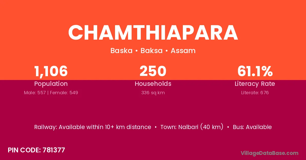 Nalbari (40 km) is the nearest town to Chamthiapara village for major economic activities and is located approximately 40 km away.
