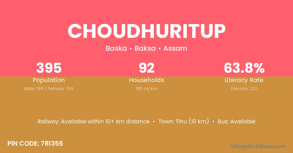 Choudhuritup village has a total population of 395 people, of which 196 are males and 199 are females.
