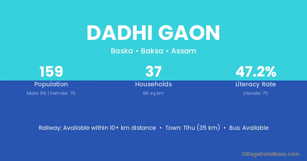 Tihu (35 km) is the nearest town to Dadhi Gaon village for major economic activities and is located approximately 35 km away.