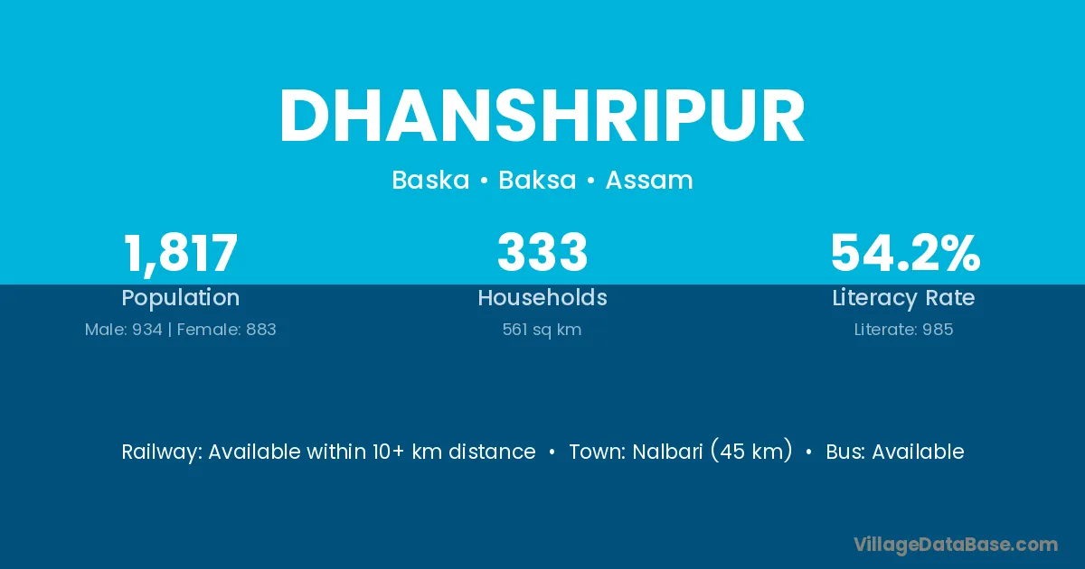 Nalbari (45 km) is the nearest town to Dhanshripur village for major economic activities and is located approximately 45 km away.