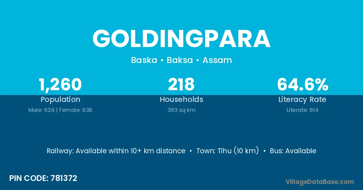 Tihu (10 km) is the nearest town to Goldingpara village for major economic activities and is located approximately 10 km away.