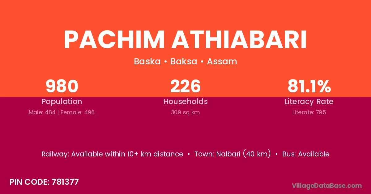 Pachim Athiabari village has a total population of 980 people, of which 484 are males and 496 are females.