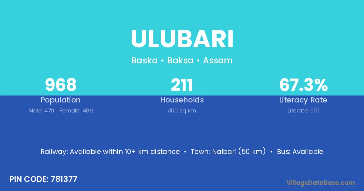Nalbari (50 km) is the nearest town to Ulubari village for major economic activities and is located approximately 50 km away.