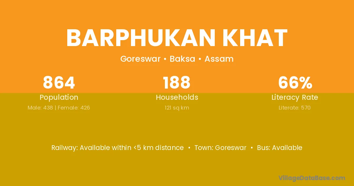 Barphukan Khat village has a total population of 864 people, of which 438 are males and 426 are females.