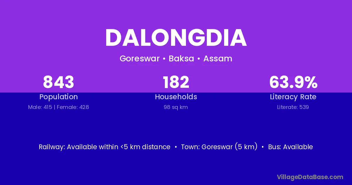 Goreswar (5 km) is the nearest town to Dalongdia village for major economic activities and is located approximately 5 km away.