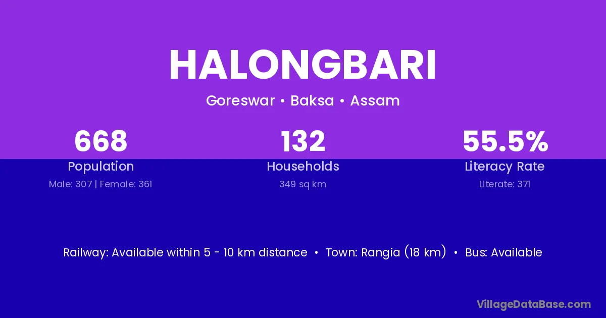 Halongbari village has a total population of 668 people, of which 307 are males and 361 are females.