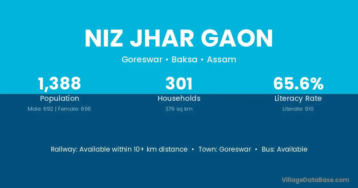 Niz Jhar Gaon village has a total population of 1,388 people, of which 692 are males and 696 are females.