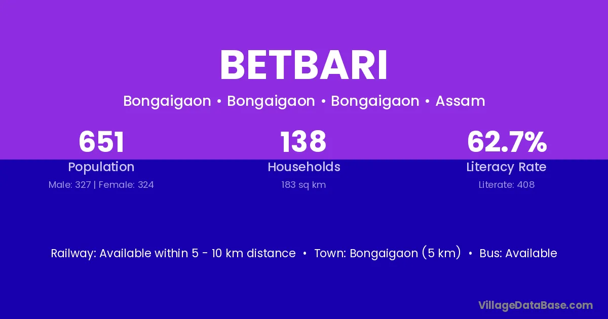 Pathsala (20 km) is the nearest town to Betbari village for major economic activities and is located approximately 20 km away.