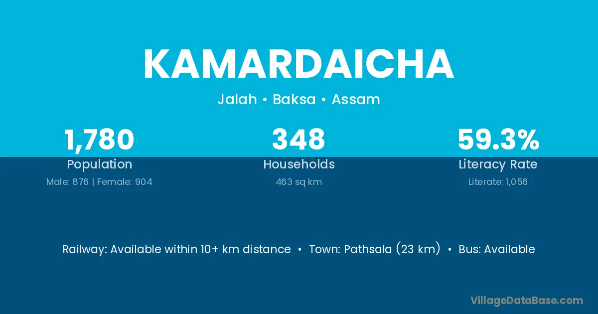 Pathsala (23 km) is the nearest town to Kamardaicha village for major economic activities and is located approximately 23 km away.