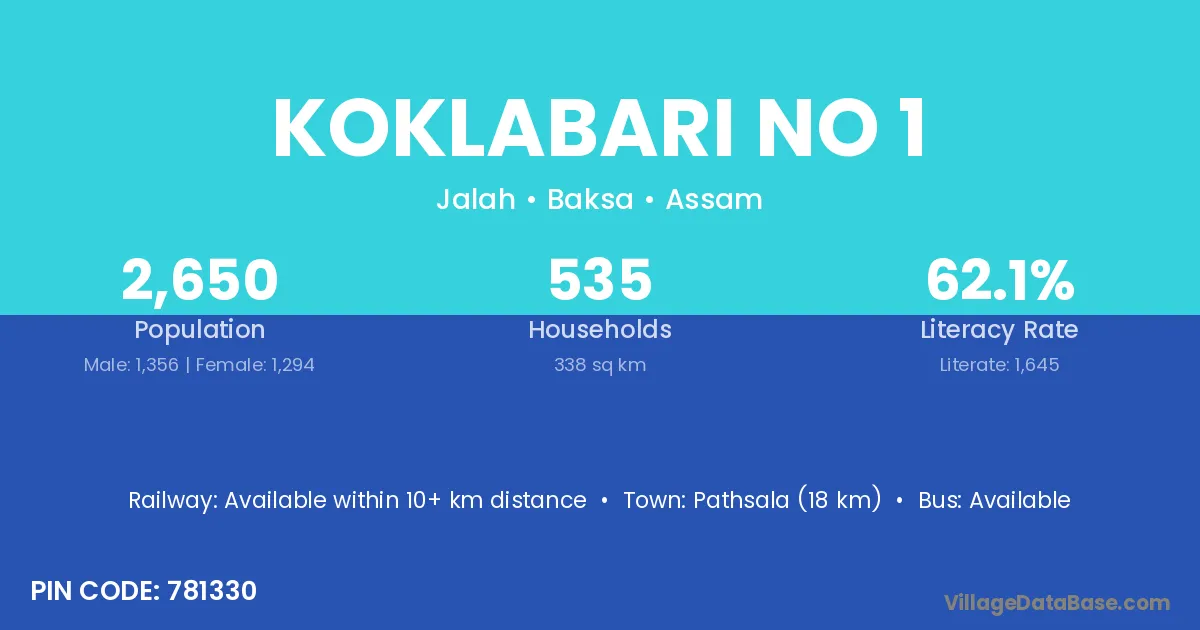 Pathsala (18 km) is the nearest town to Koklabari No 1 village for major economic activities and is located approximately 18 km away.