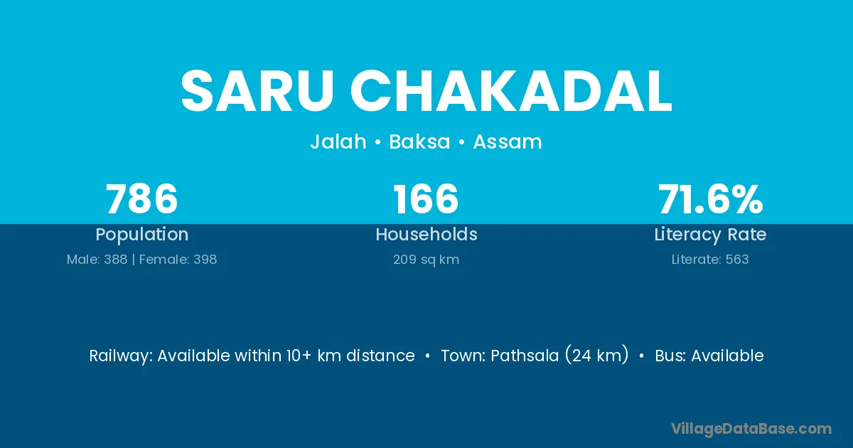 Pathsala (24 km) is the nearest town to Saru Chakadal village for major economic activities and is located approximately 24 km away.