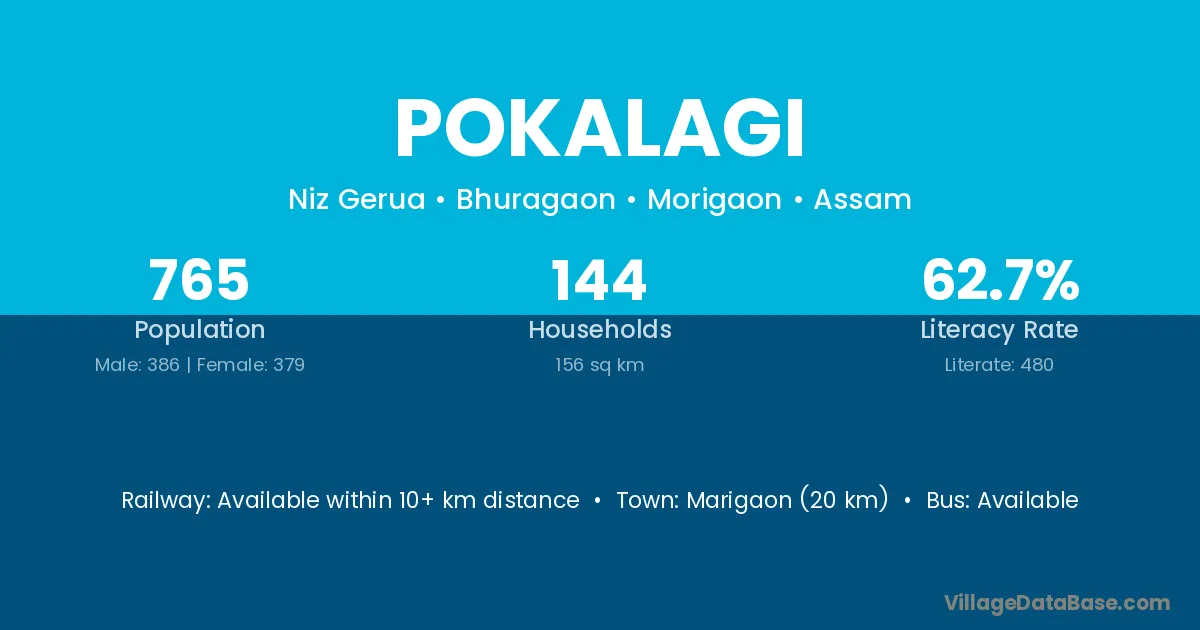The literacy rate of Pokalagi village is 56.34%. Male literacy stands at 64.19% and female literacy at 48.39%.