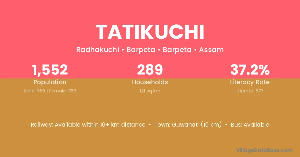 Pathsala (15 km) is the nearest town to Tatikuchi village for major economic activities and is located approximately 15 km away.