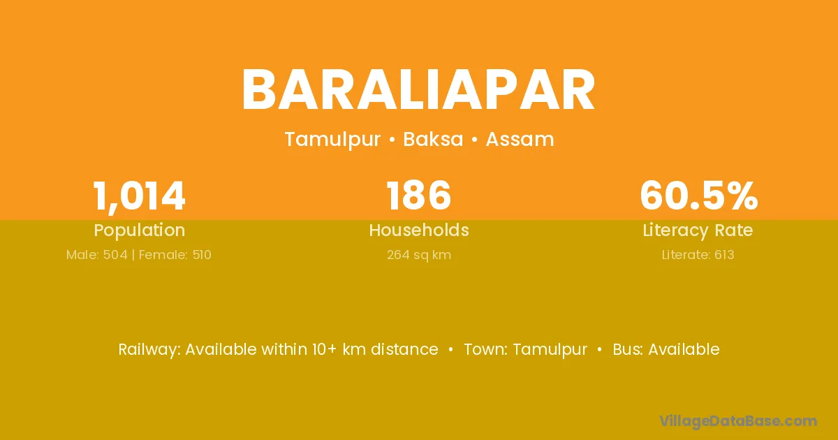 Baraliapar village has a total population of 1,014 people, of which 504 are males and 510 are females.