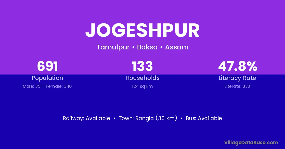 Rangia (30 km) is the nearest town to Jogeshpur village for major economic activities and is located approximately 30 km away.