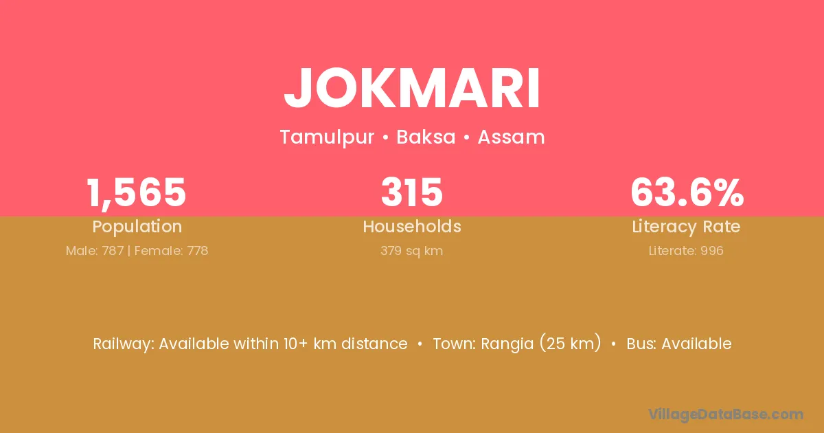 Rangia (25 km) is the nearest town to Jokmari village for major economic activities and is located approximately 25 km away.