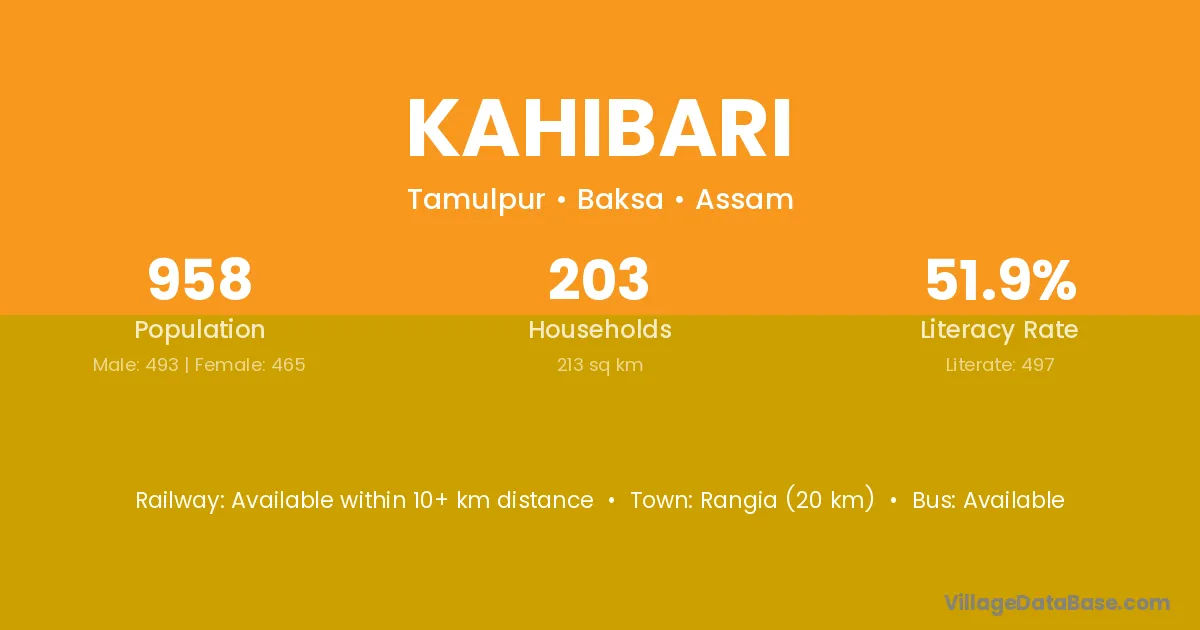 Rangia (20 km) is the nearest town to Kahibari village for major economic activities and is located approximately 20 km away.