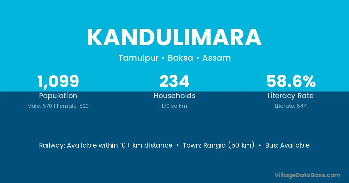 Rangia (50 km) is the nearest town to Kandulimara village for major economic activities and is located approximately 50 km away.