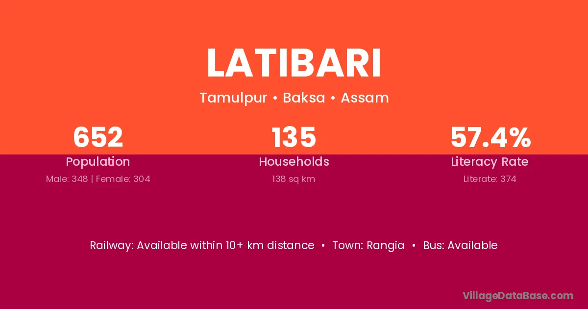 Latibari village has a total population of 652 people, of which 348 are males and 304 are females.