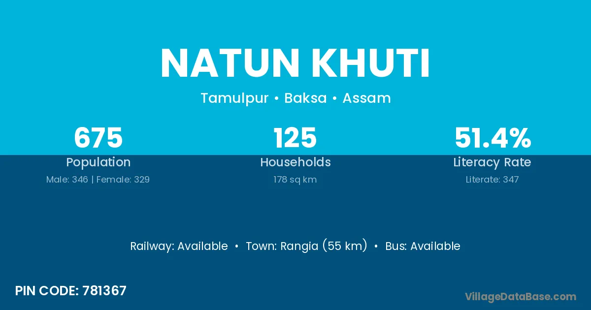 Rangia (55 km) is the nearest town to Natun Khuti village for major economic activities and is located approximately 55 km away.