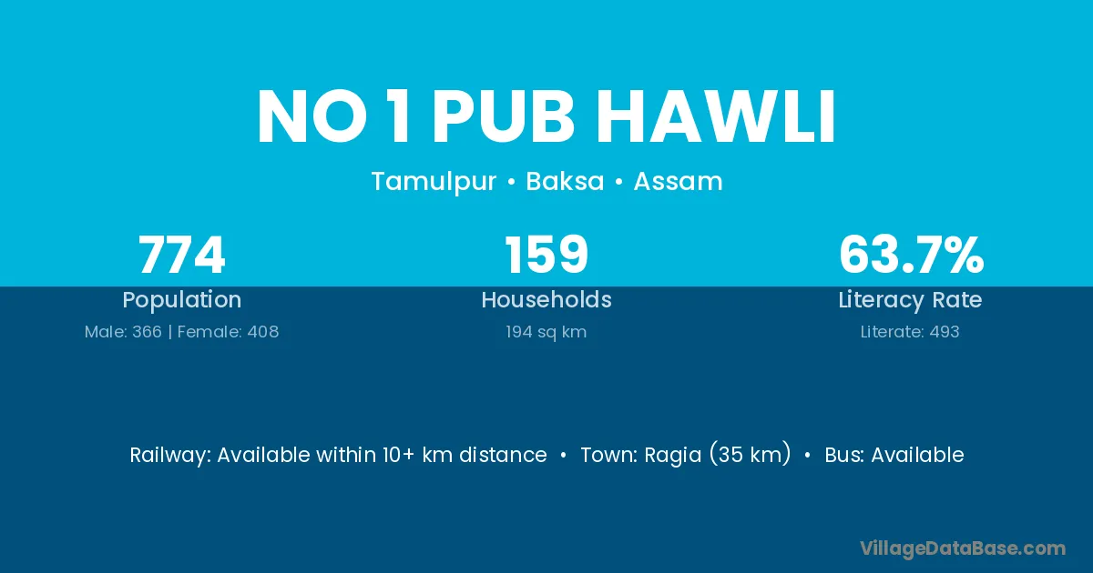 No 1 Pub Hawli village has a total population of 774 people, of which 366 are males and 408 are females.