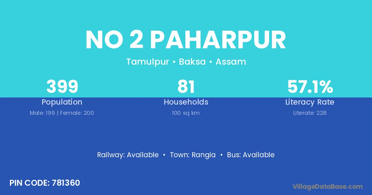 No 2 Paharpur village has a total population of 399 people, of which 199 are males and 200 are females.