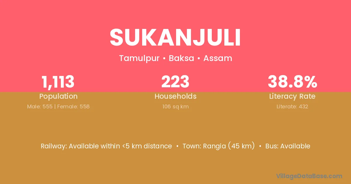 Rangia (45 km) is the nearest town to Sukanjuli village for major economic activities and is located approximately 45 km away.