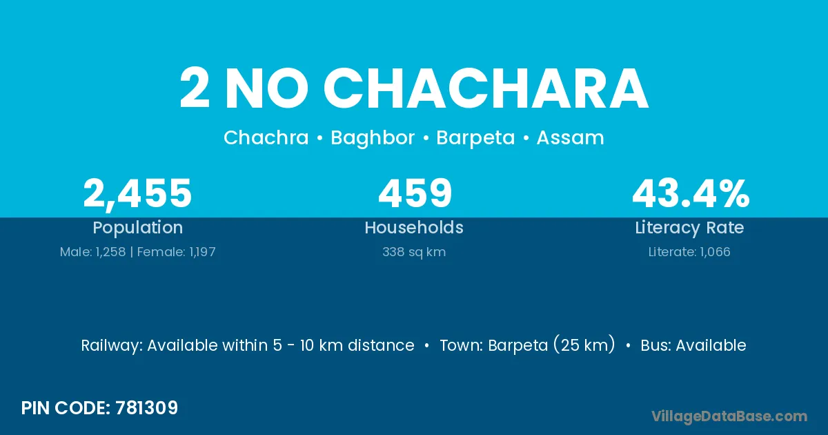 Barpeta (25 km) is the nearest town to 2 No Chachara village for major economic activities and is located approximately 25 km away.