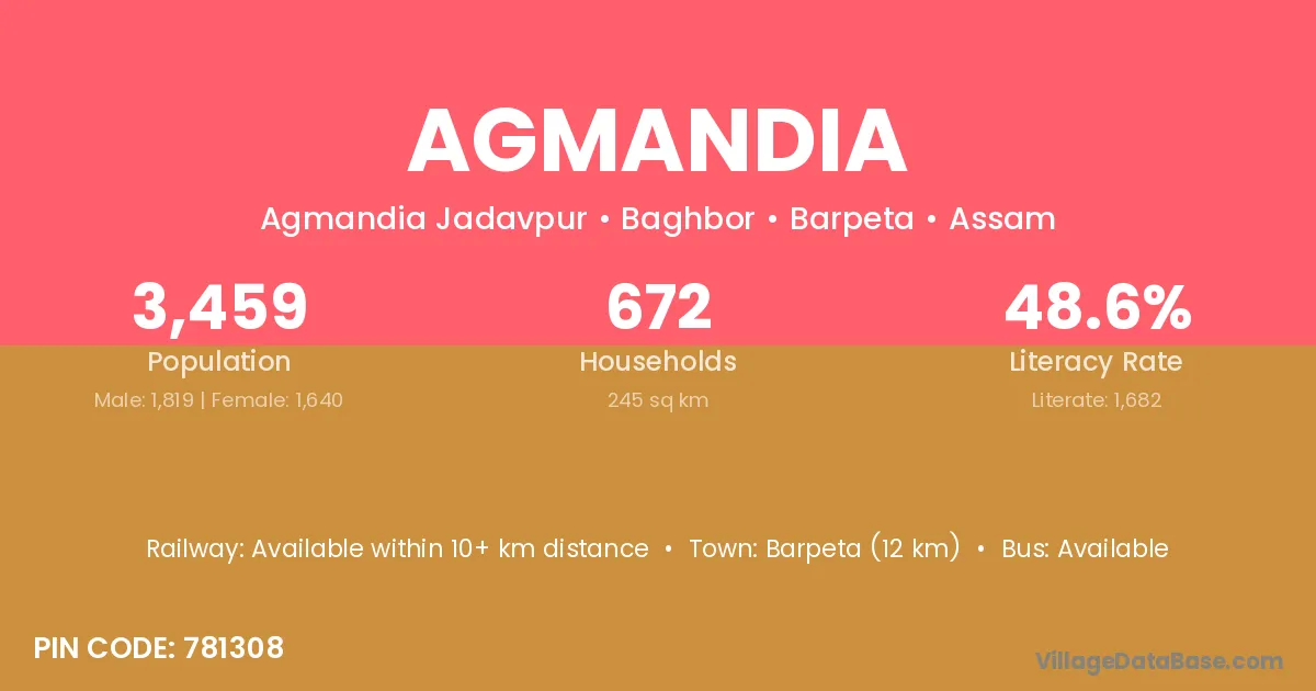 Barpeta (12 km) is the nearest town to Agmandia village for major economic activities and is located approximately 12 km away.