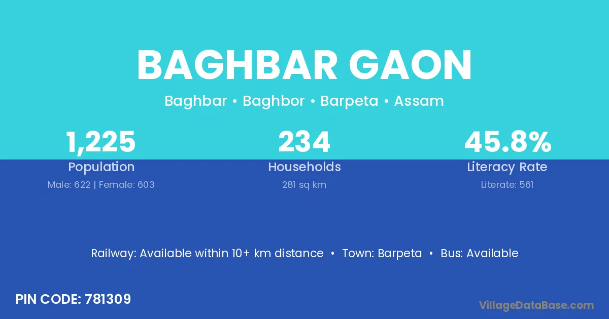 Baghbar Gaon village has a total population of 1,225 people, of which 622 are males and 603 are females.