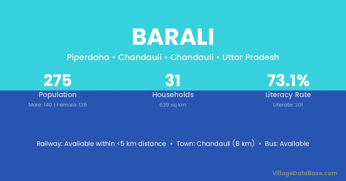 The literacy rate of Barali village is 7.69%. Male literacy stands at 14.29% and female literacy at 0.00%.