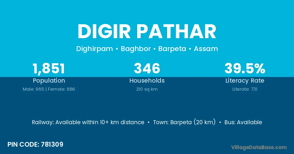 Barpeta (20 km) is the nearest town to Digir Pathar village for major economic activities and is located approximately 20 km away.