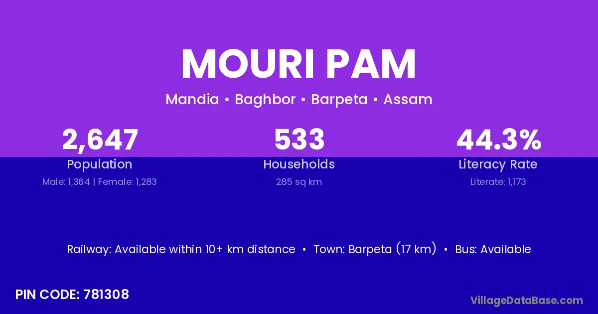 Barpeta (17 km) is the nearest town to Mouri Pam village for major economic activities and is located approximately 17 km away.