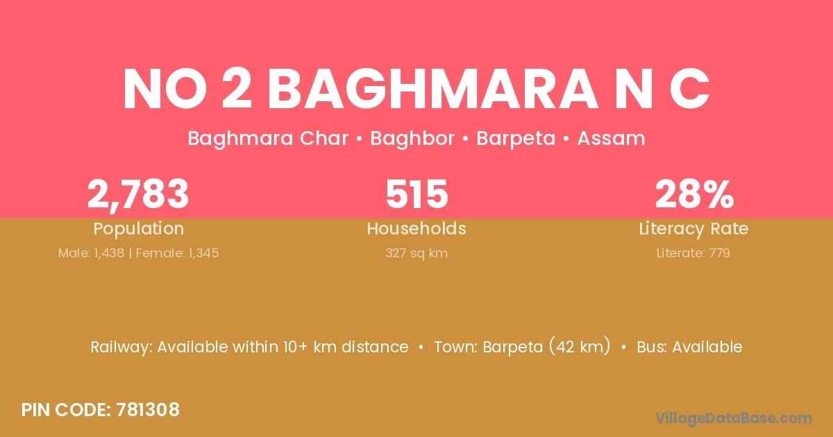 Barpeta (42 km) is the nearest town to No 2 Baghmara N C village for major economic activities and is located approximately 42 km away.
