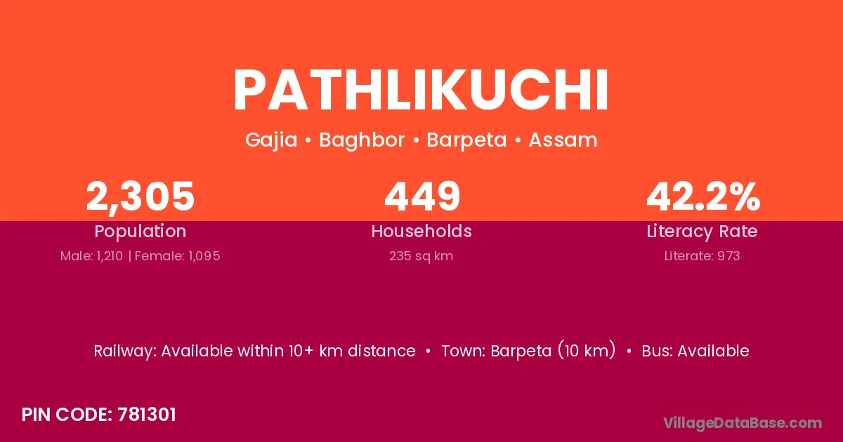 Barpeta (10 km) is the nearest town to Pathlikuchi village for major economic activities and is located approximately 10 km away.