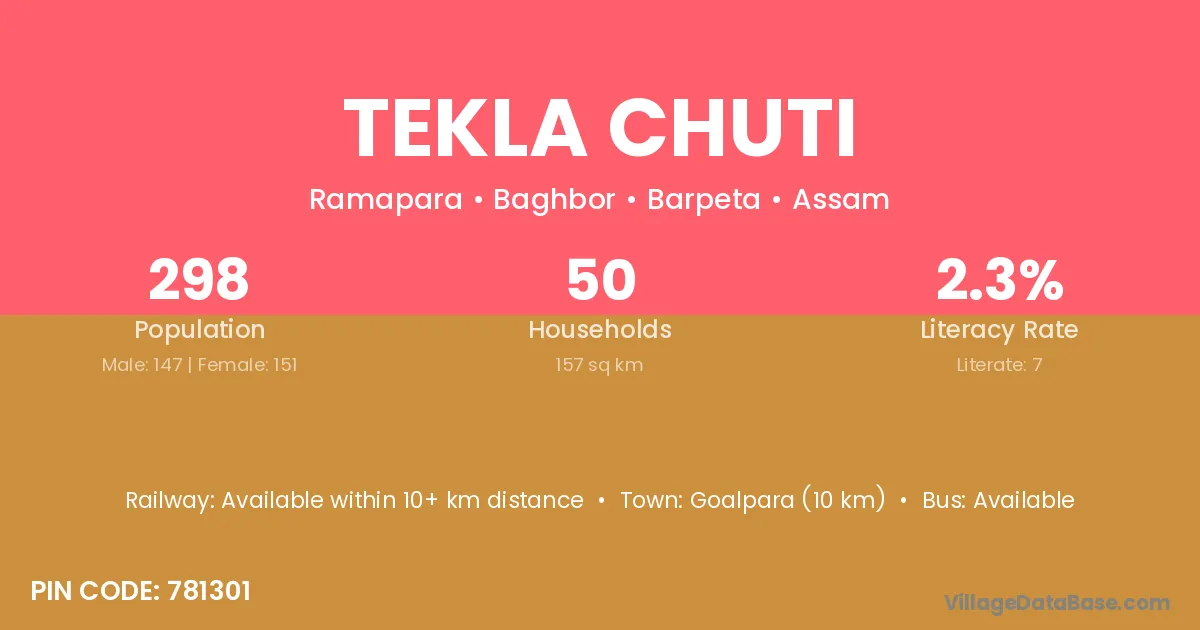 Goalpara (10 km) is the nearest town to Tekla Chuti village for major economic activities and is located approximately 10 km away.