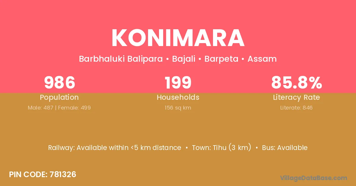 Konimara village has a total population of 986 people, of which 487 are males and 499 are females.