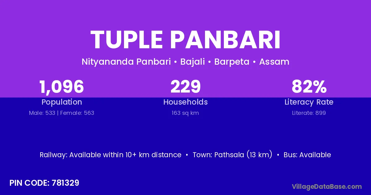 Pathsala (13 km) is the nearest town to Tuple Panbari village for major economic activities and is located approximately 13 km away.