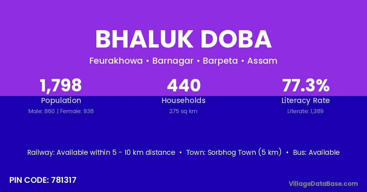 Sorbhog Town (5 km) is the nearest town to Bhaluk Doba village for major economic activities and is located approximately 5 km away.