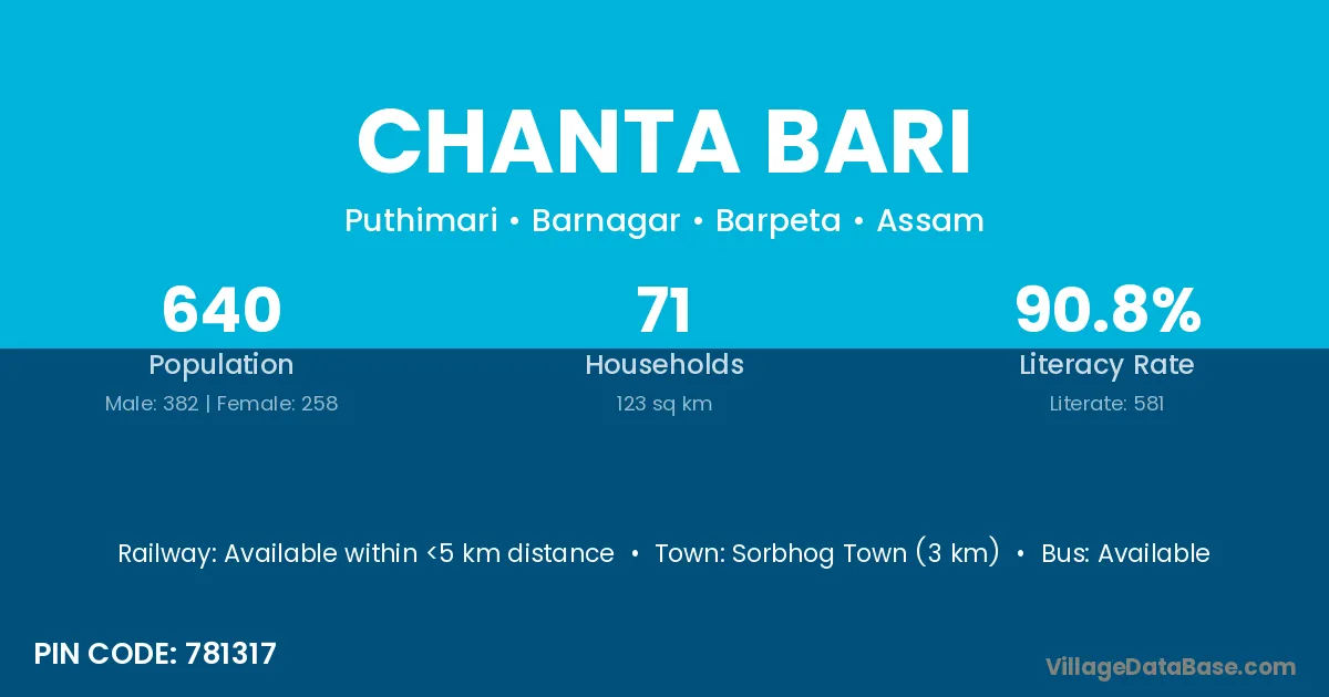 Sorbhog Town (3 km) is the nearest town to Chanta Bari village for major economic activities and is located approximately 3 km away.