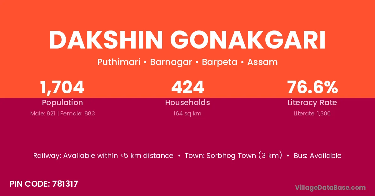 Sorbhog Town (3 km) is the nearest town to Dakshin Gonakgari village for major economic activities and is located approximately 3 km away.