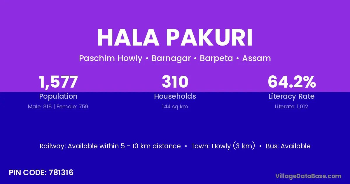 Howly (3 km) is the nearest town to Hala Pakuri village for major economic activities and is located approximately 3 km away.