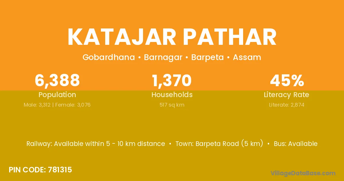 Barpeta Road (5 km) is the nearest town to Katajar Pathar village for major economic activities and is located approximately 5 km away.