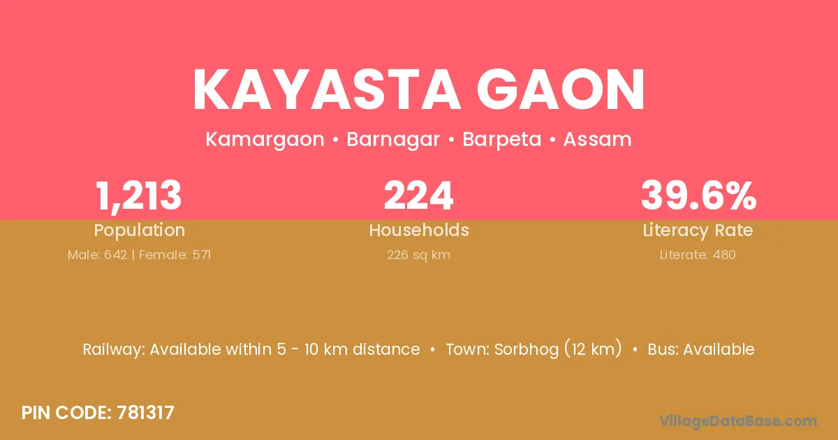 Sorbhog (12 km) is the nearest town to Kayasta Gaon village for major economic activities and is located approximately 12 km away.