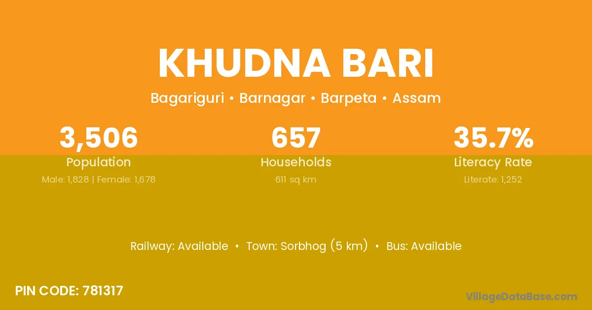 Sorbhog (5 km) is the nearest town to Khudna Bari village for major economic activities and is located approximately 5 km away.