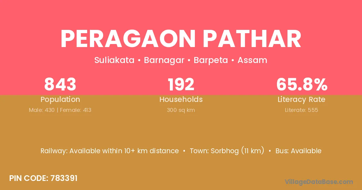 Sorbhog (11 km) is the nearest town to Peragaon Pathar village for major economic activities and is located approximately 11 km away.