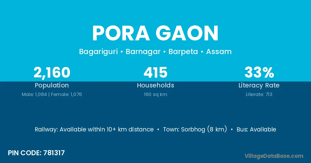 Sorbhog (8 km) is the nearest town to Pora Gaon village for major economic activities and is located approximately 8 km away.