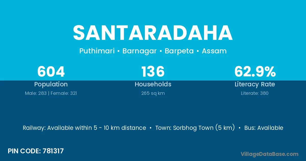 Sorbhog Town (5 km) is the nearest town to Santaradaha village for major economic activities and is located approximately 5 km away.
