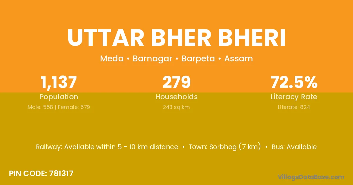 Sorbhog (7 km) is the nearest town to Uttar Bher Bheri village for major economic activities and is located approximately 7 km away.