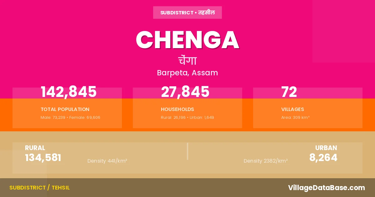 Chenga is a town and Subdivision in the Barpeta district of the Assam. In India, a Subdivision is a subdivision of a district responsible for the administration and revenue collection of a specific area within the district. Subdivisions play a crucial role in the local governance structure, contributing significantly to the development and administration of their communities.